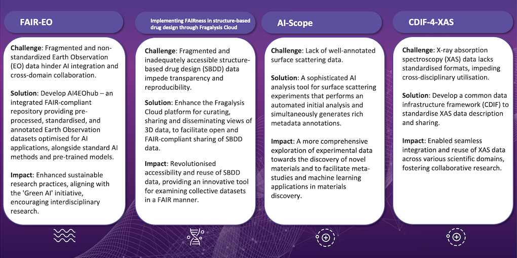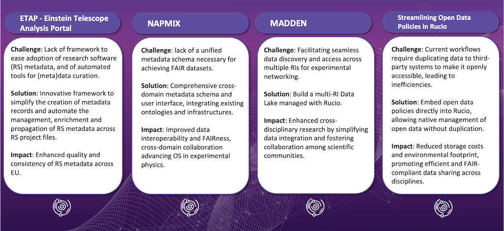 OSCARS enhances cross-fertilisation between the Science Clusters by establishing common approaches to FAIR data management and data annotation. Concrete use cases and science demonstrators stemming from the OSCARS funded projects will help to adopt more FAIR data practices to support reproducibility and robustness in Open Science.